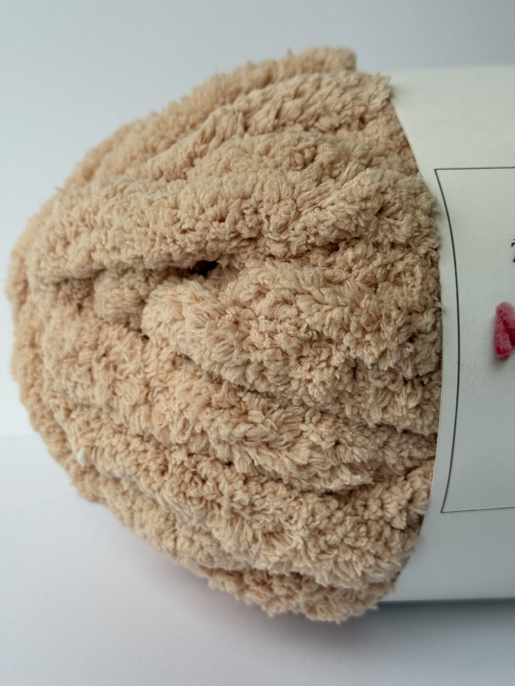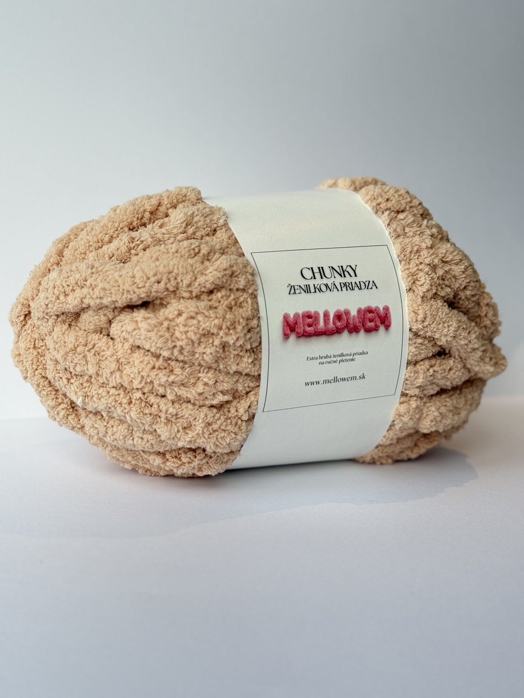 Chunky extra hrubá ženilková priadza béžovej farby určená na ručné pletenie. Je veľmi mäkká, nadýchaná a príjemná na dotyk. Vďaka svojej hrúbke umožňuje rýchlu a jednoduchú prácu. Výsledné výrobky sú objemné, hrejivé a pôsobia nadýchane.