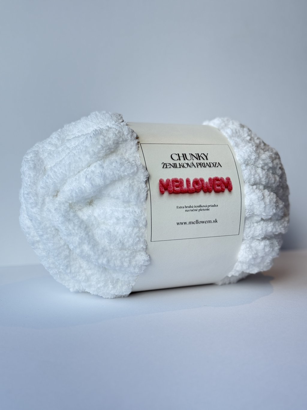 Chunky extra hrubá ženilková priadza bielej farby určená na ručné pletenie. Je veľmi mäkká, nadýchaná a príjemná na dotyk. Vďaka svojej hrúbke umožňuje rýchlu a jednoduchú prácu. Výsledné výrobky sú objemné, hrejivé a pôsobia nadýchane.