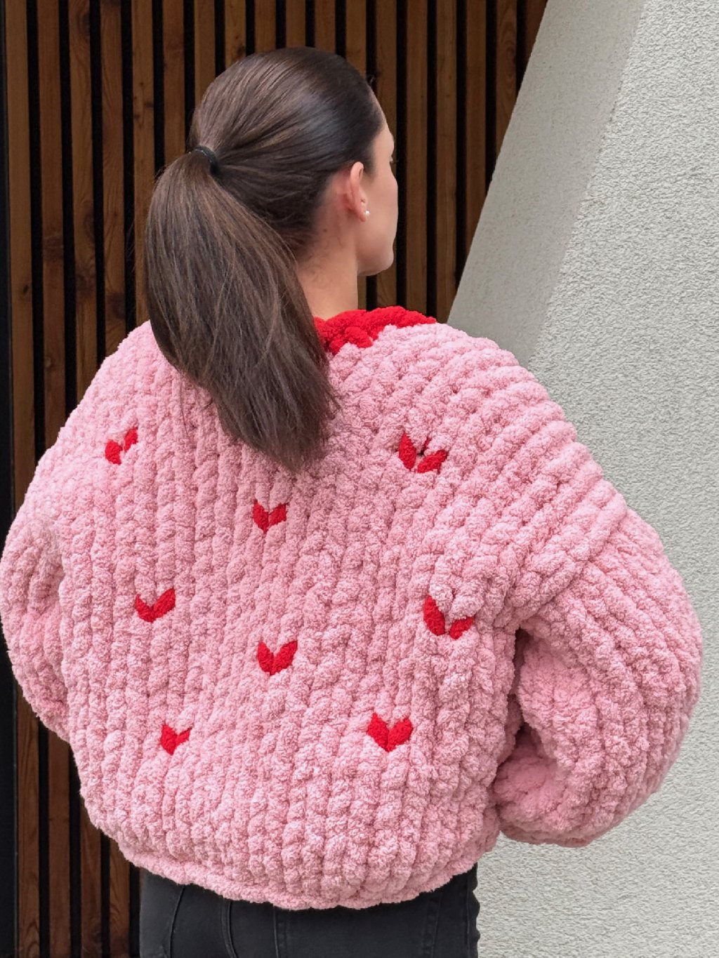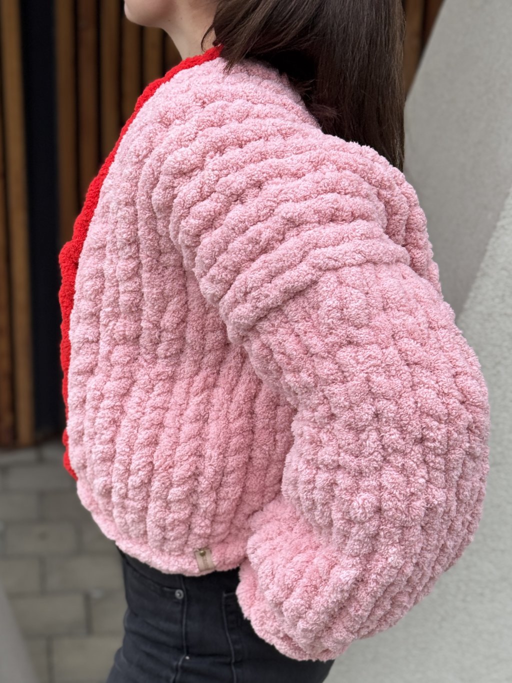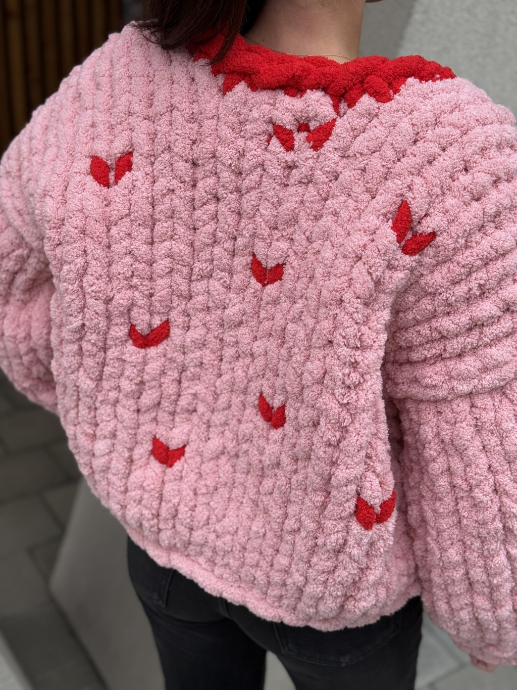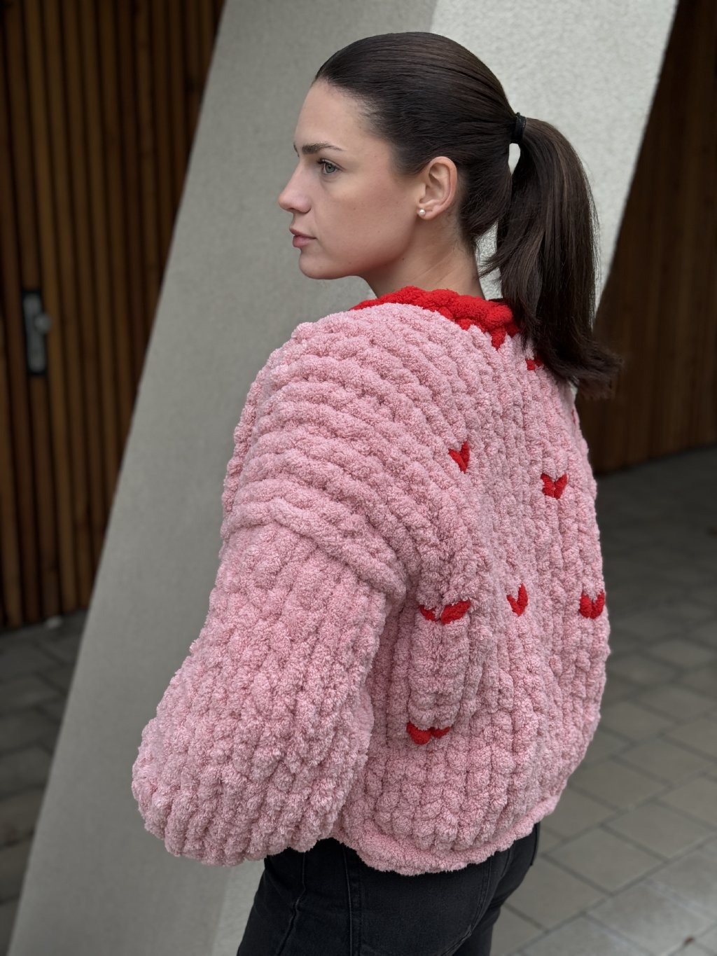 Ručne pletený sveter z mäkkej, extra hrubej ženilkovej priadze, ktorý je príjemný na dotyk a dodá okamžité teplo. Svetloružová farba pôsobí jemne a nežne, zatiaľ čo malé červené srdcia na chrbte a červené lemovanie dodávajú svetru hravý a jedinečný charakter. Ideálny kúsok na dni, keď chceš spojiť pohodlie, štýl a jemný detail, ktorý zaujme na prvý pohľad.
