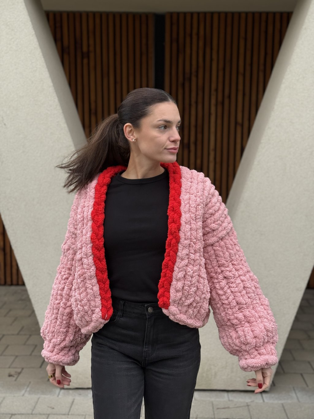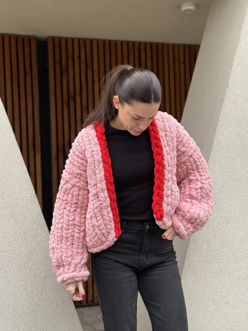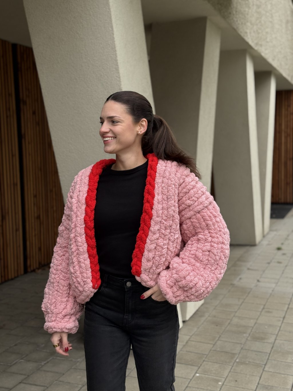 Ručne pletený sveter z mäkkej, extra hrubej ženilkovej priadze, ktorý je príjemný na dotyk a dodá okamžité teplo. Svetloružová farba pôsobí jemne a nežne, zatiaľ čo malé červené srdcia na chrbte a červené lemovanie dodávajú svetru hravý a jedinečný charakter. Ideálny kúsok na dni, keď chceš spojiť pohodlie, štýl a jemný detail, ktorý zaujme na prvý pohľad.