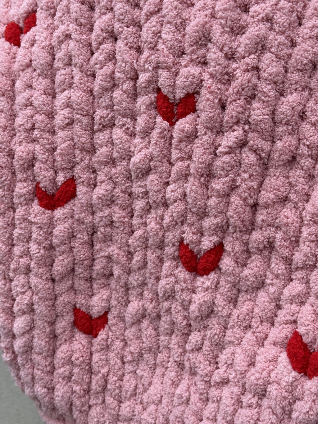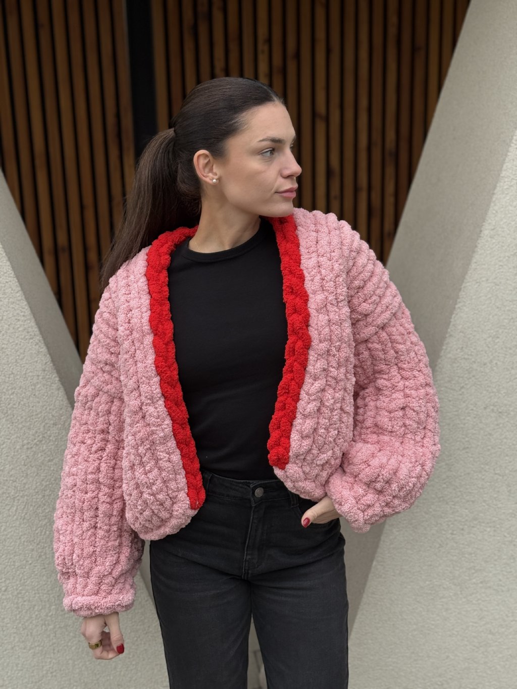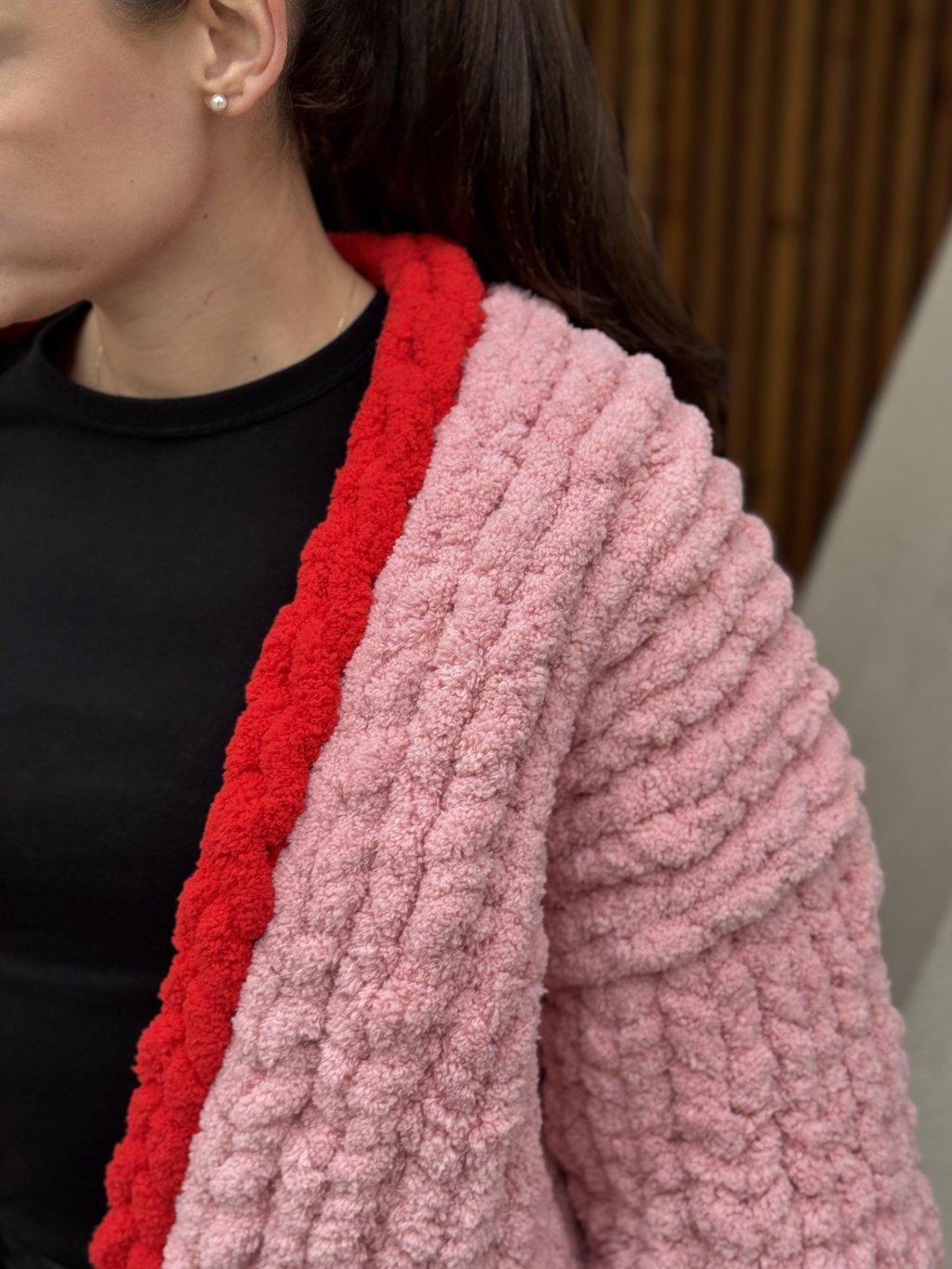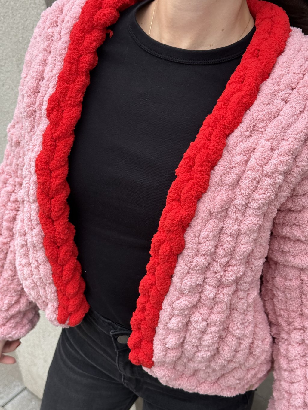 Ručne pletený sveter z mäkkej, extra hrubej ženilkovej priadze, ktorý je príjemný na dotyk a dodá okamžité teplo. Svetloružová farba pôsobí jemne a nežne, zatiaľ čo malé červené srdcia na chrbte a červené lemovanie dodávajú svetru hravý a jedinečný charakter. Ideálny kúsok na dni, keď chceš spojiť pohodlie, štýl a jemný detail, ktorý zaujme na prvý pohľad.