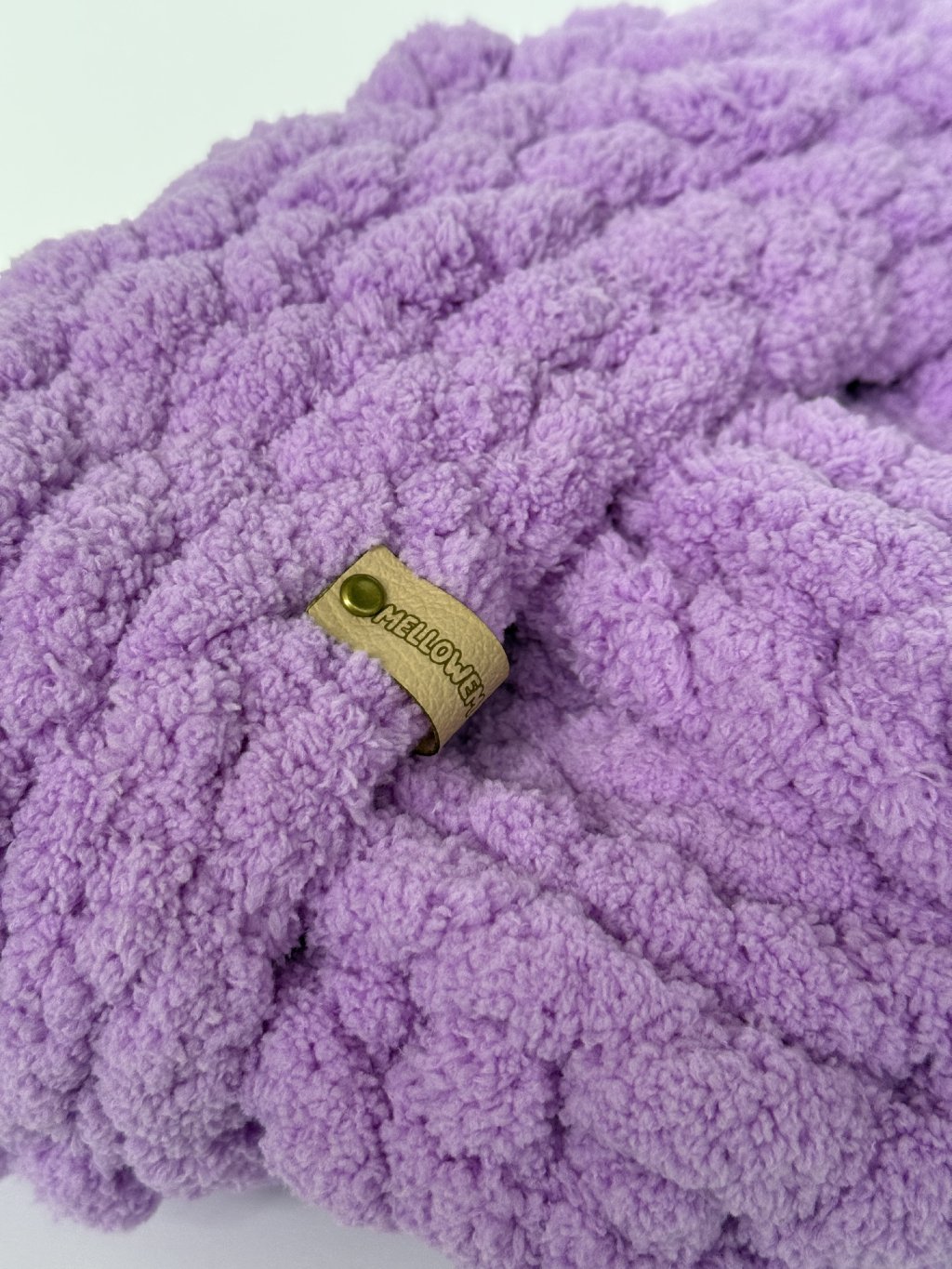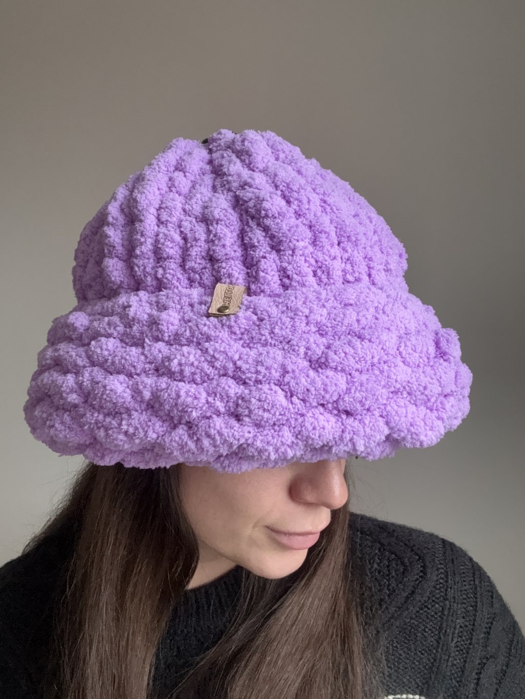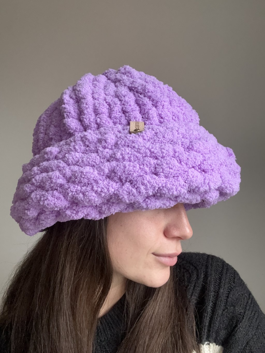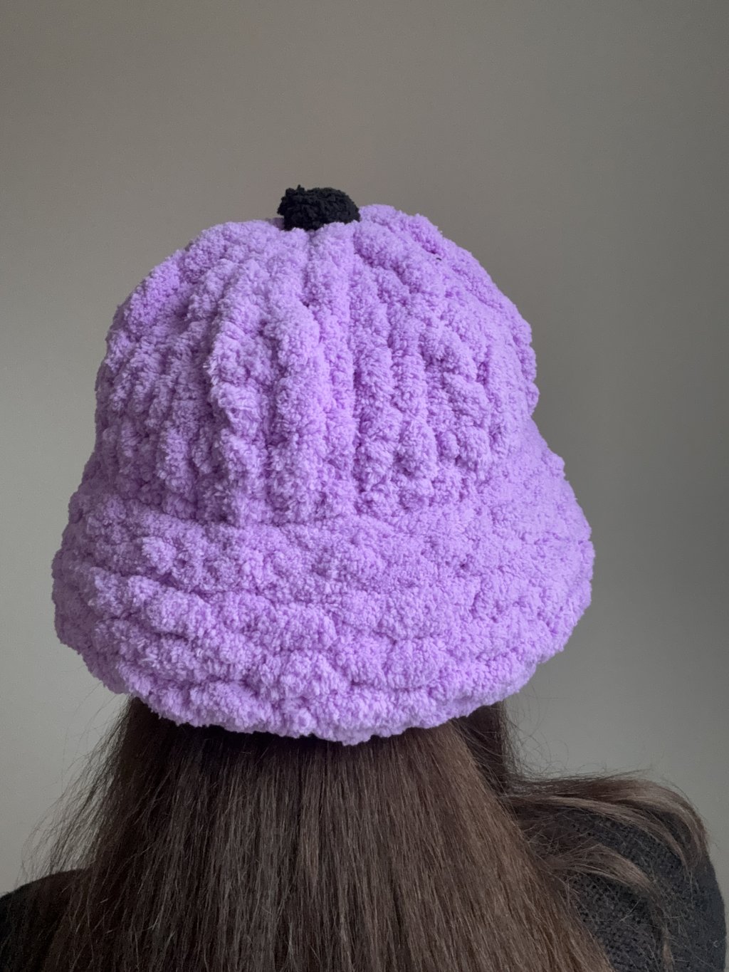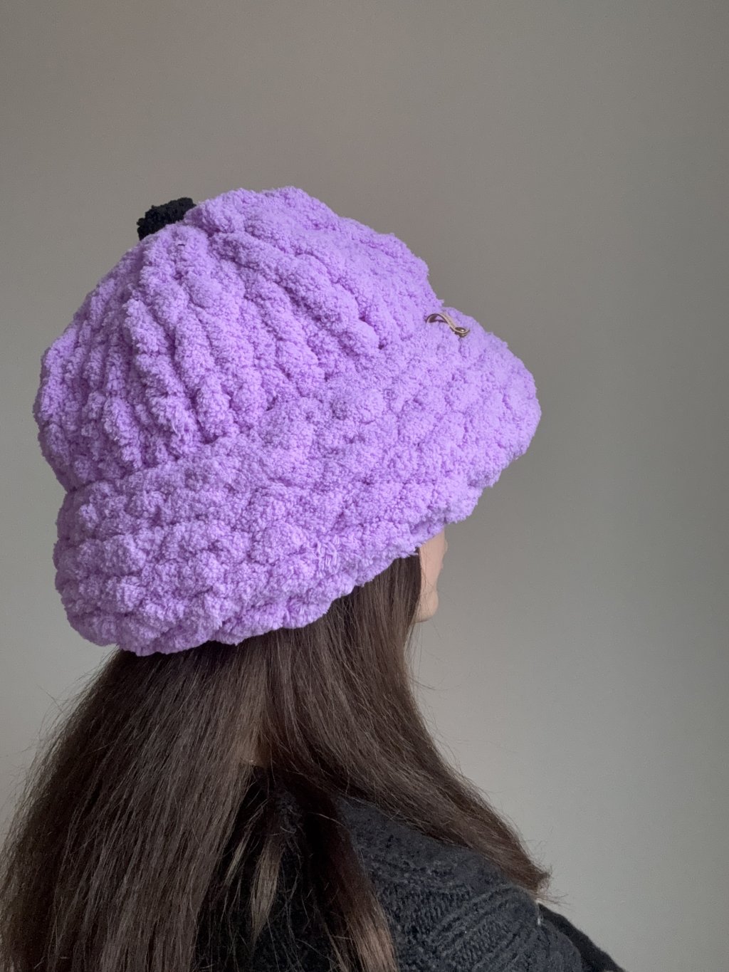 Ručne pletená čiapka z mäkkej extra hrubej ženilkovej priadze, ktorá je hrejivá a príjemná na dotyk. Fialová farba v spojení s malým čiernym brmbolcom vytvára svieži, výrazný a zároveň elegantný vzhľad ideálny na chladné dni.