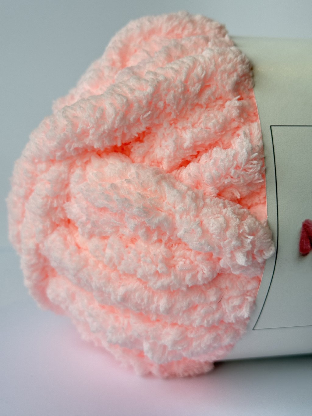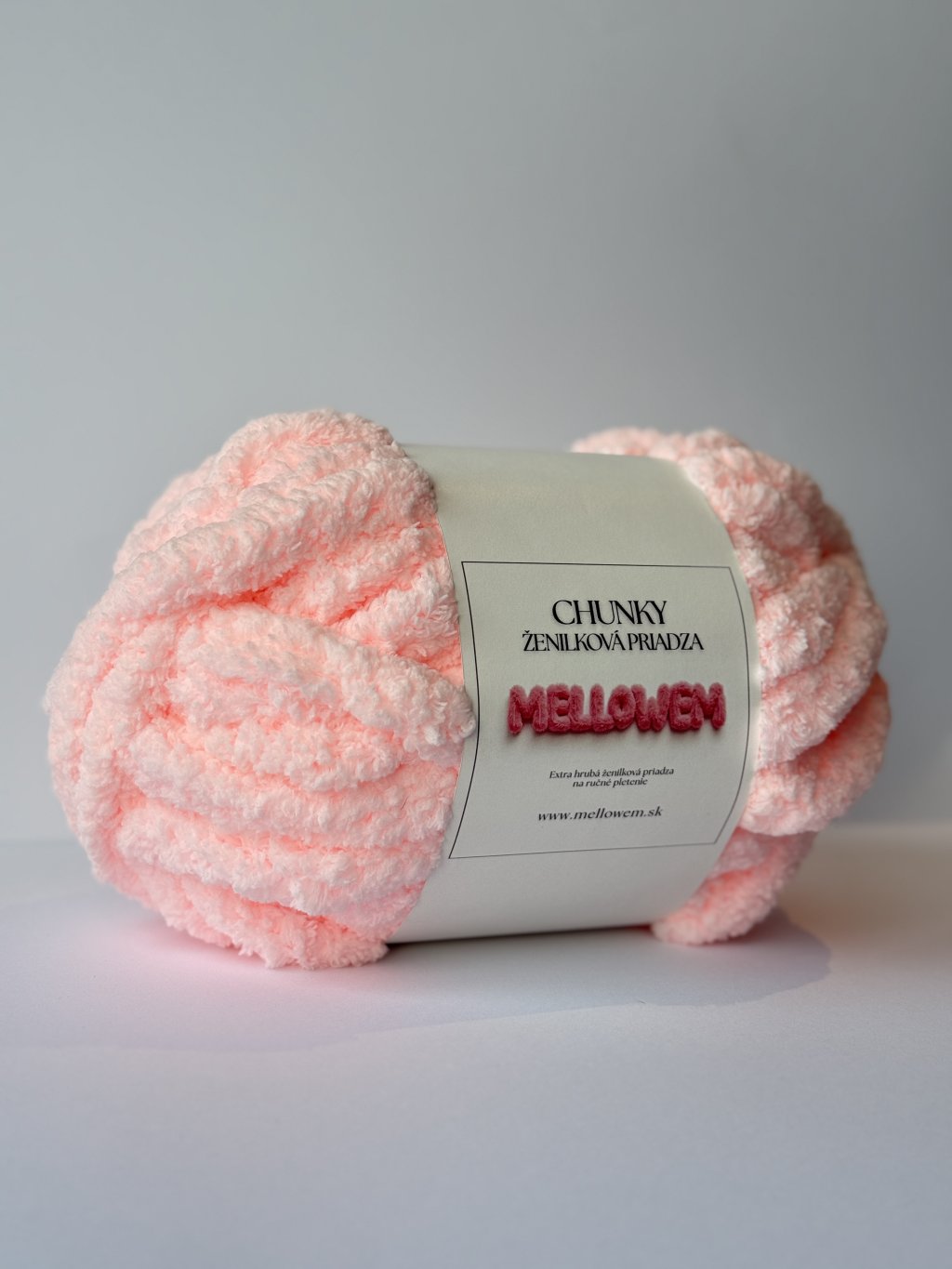 Chunky extra hrubá ženilková priadza svetloružovej farby určená na ručné pletenie. Je veľmi mäkká, nadýchaná a príjemná na dotyk. Vďaka svojej hrúbke umožňuje rýchlu a jednoduchú prácu. Výsledné výrobky sú objemné, hrejivé a pôsobia nadýchane.