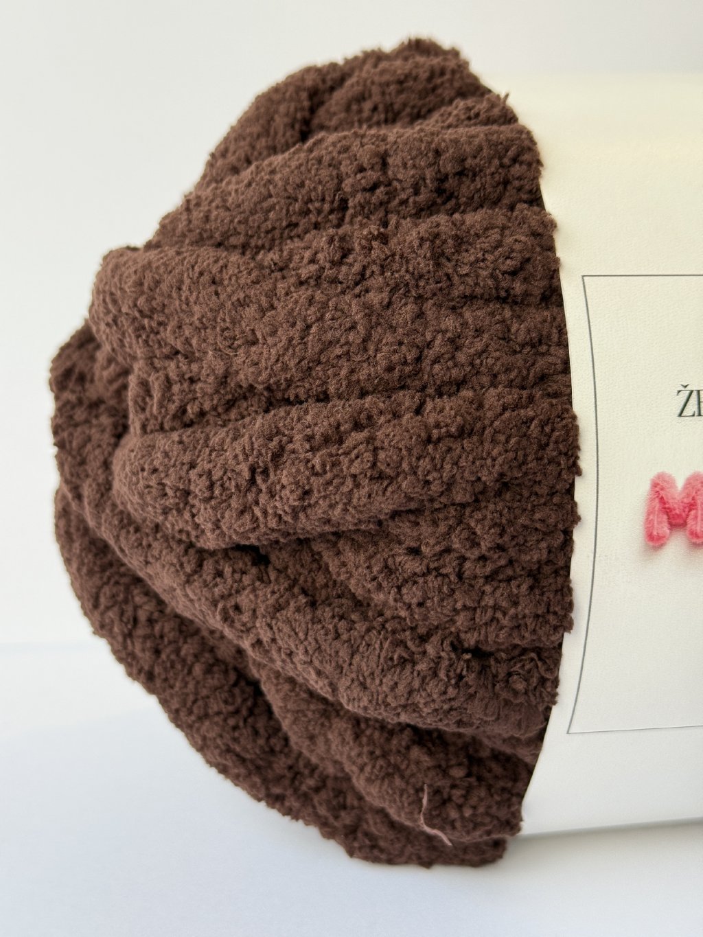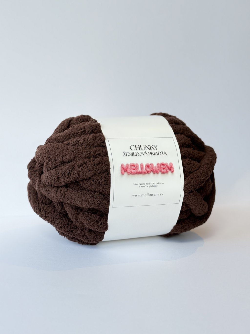 Chunky extra hrubá ženilková priadza tmavohnedej farby určená na ručné pletenie. Je veľmi mäkká, nadýchaná a príjemná na dotyk. Vďaka svojej hrúbke umožňuje rýchlu a jednoduchú prácu. Výsledné výrobky sú objemné, hrejivé a pôsobia nadýchane.